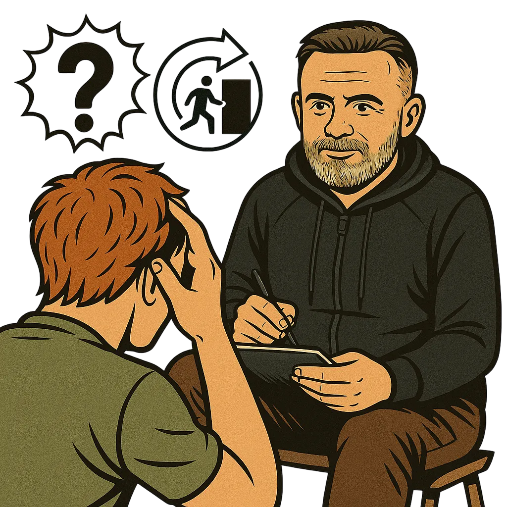 To nie jest "zwierzanie się". To spotkanie strategiczne. Analizujemy, co nie działa i co robimy tu i teraz, żeby to naprawić. Nie będę Ci mówił, jak masz żyć. Pomogę Ci znaleźć narzędzia, żebyś odzyskał kontrolę. Konkretnie i bez owijania w bawełnę.